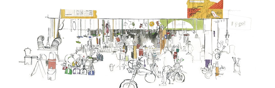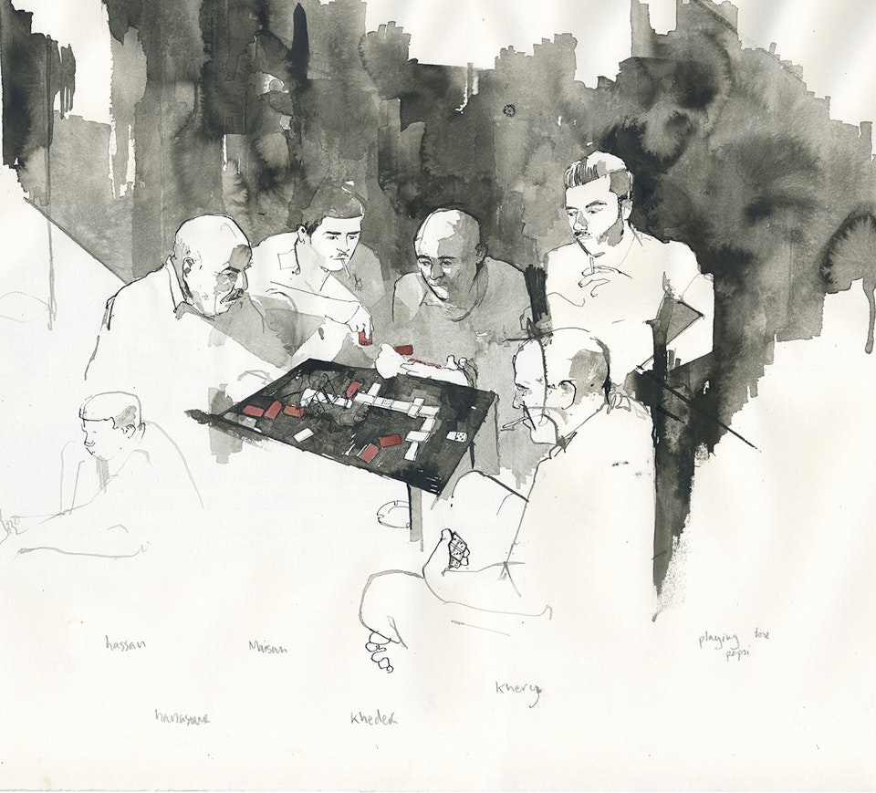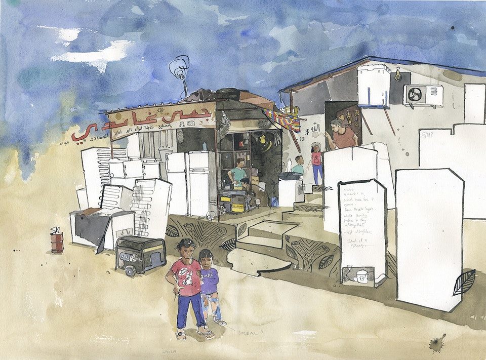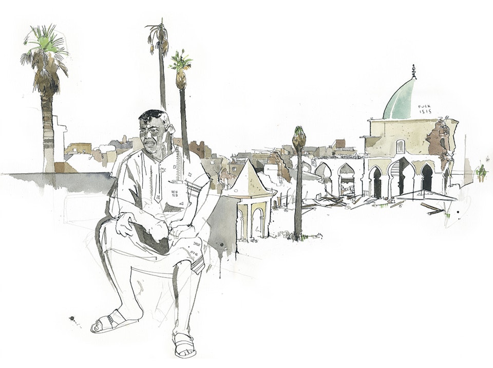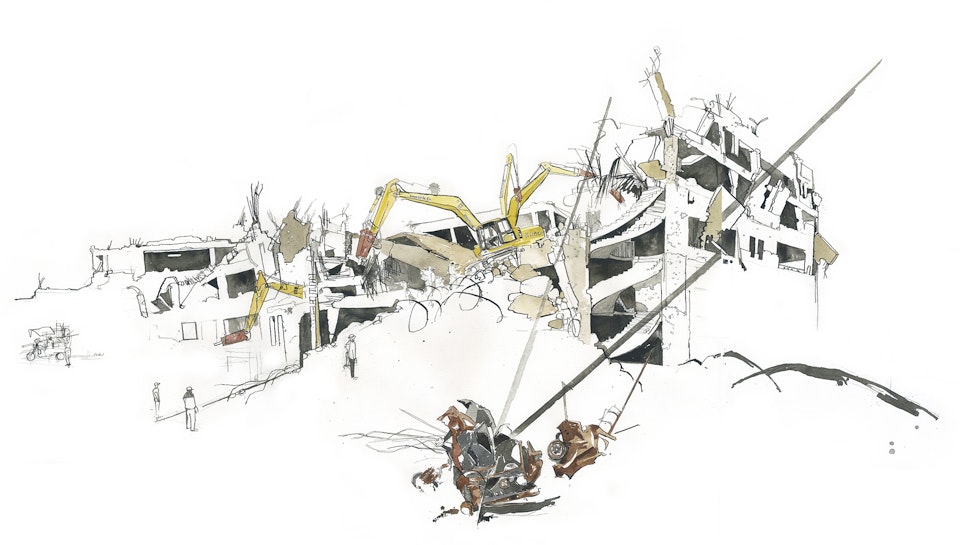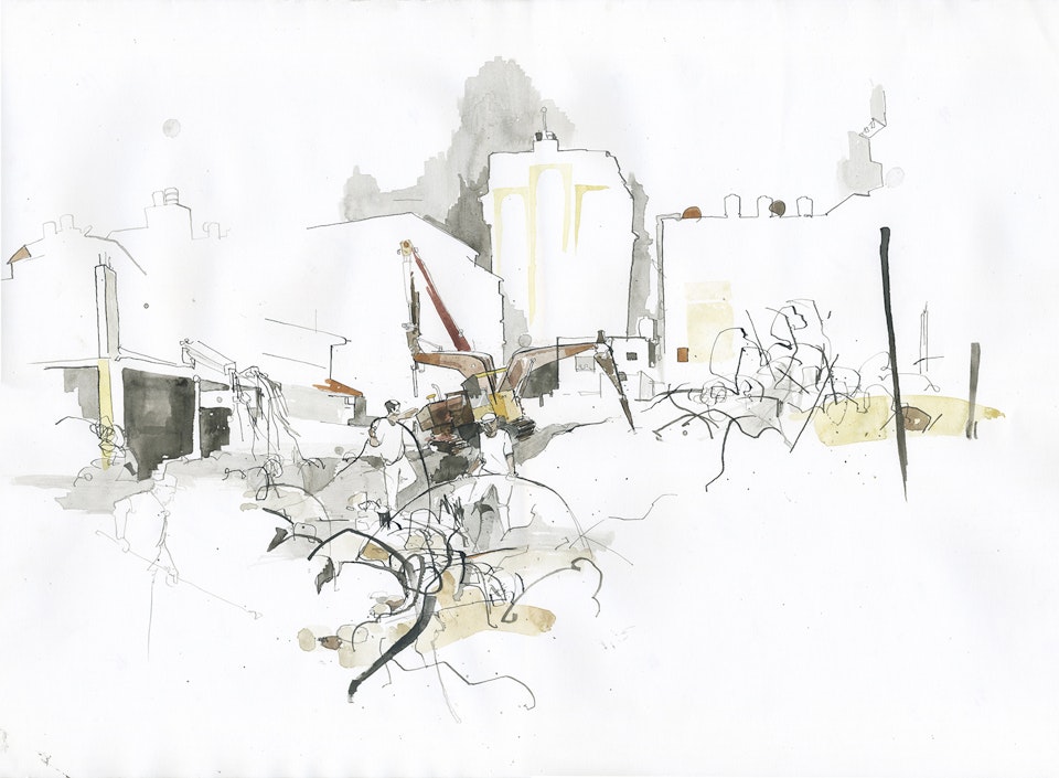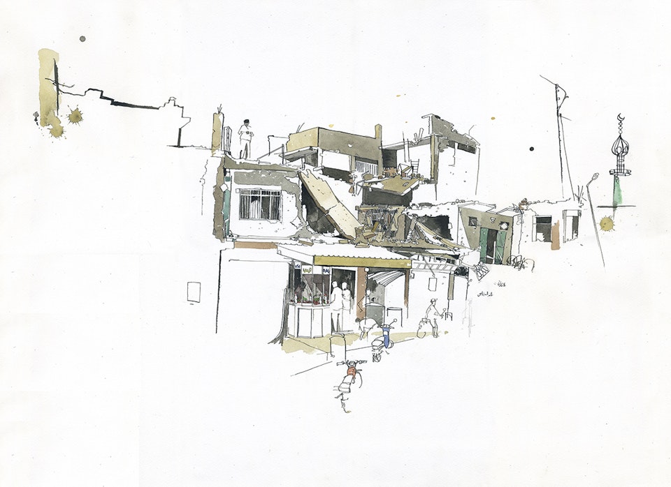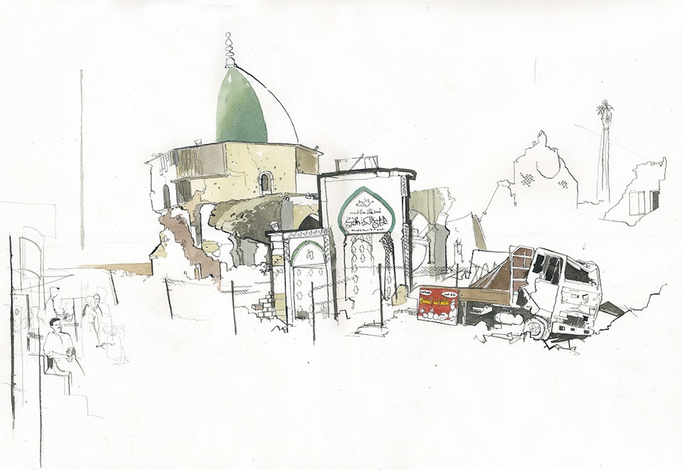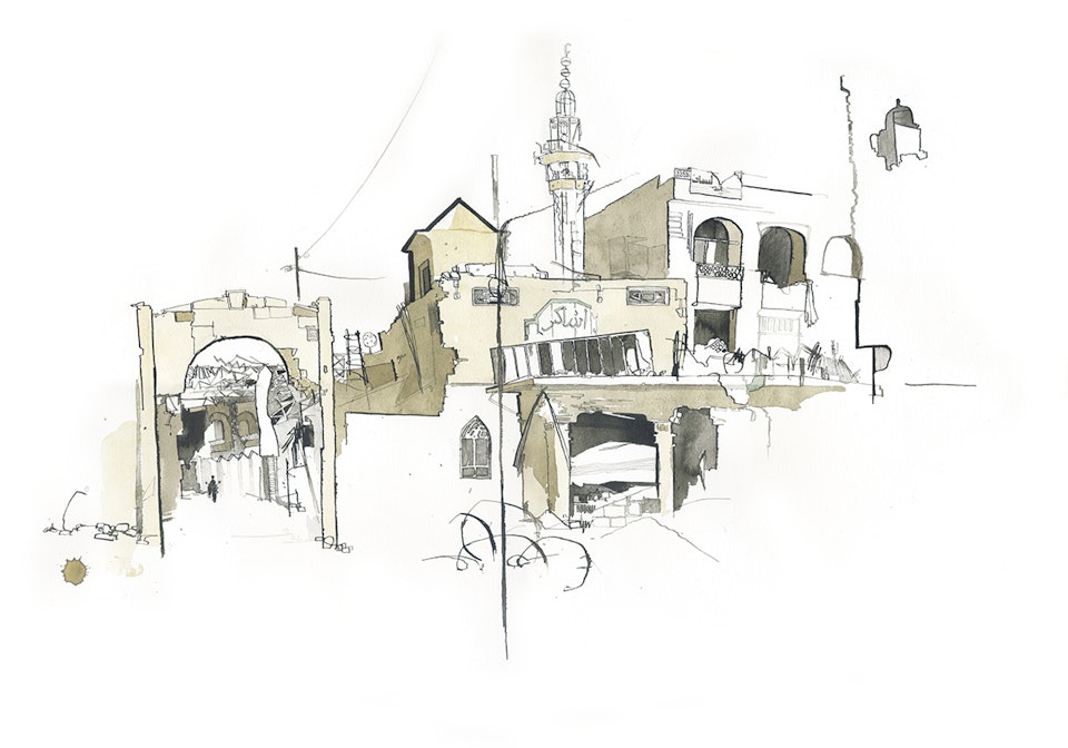 This used to be a multi storey car park in downtown Mosul. But over the two days that I drew it it is slowly being demolished. Each morning at 4am these men start work this car park in West Mosul. By Midday it is too hot to work an more. They charge $300 for the use of their bulldozer and the metal is pulled out for scrap. It's the beginnings of an overwhelming and much needed rebuilding.