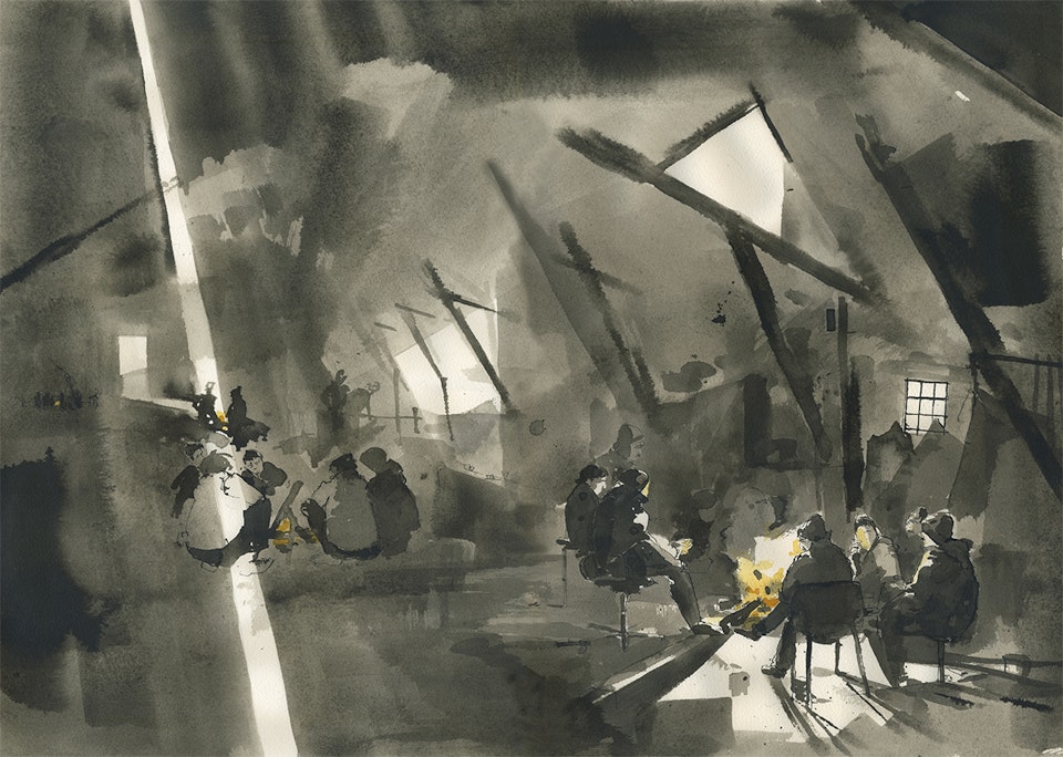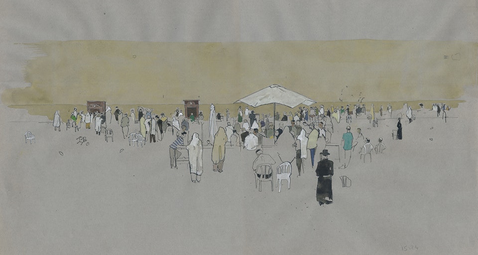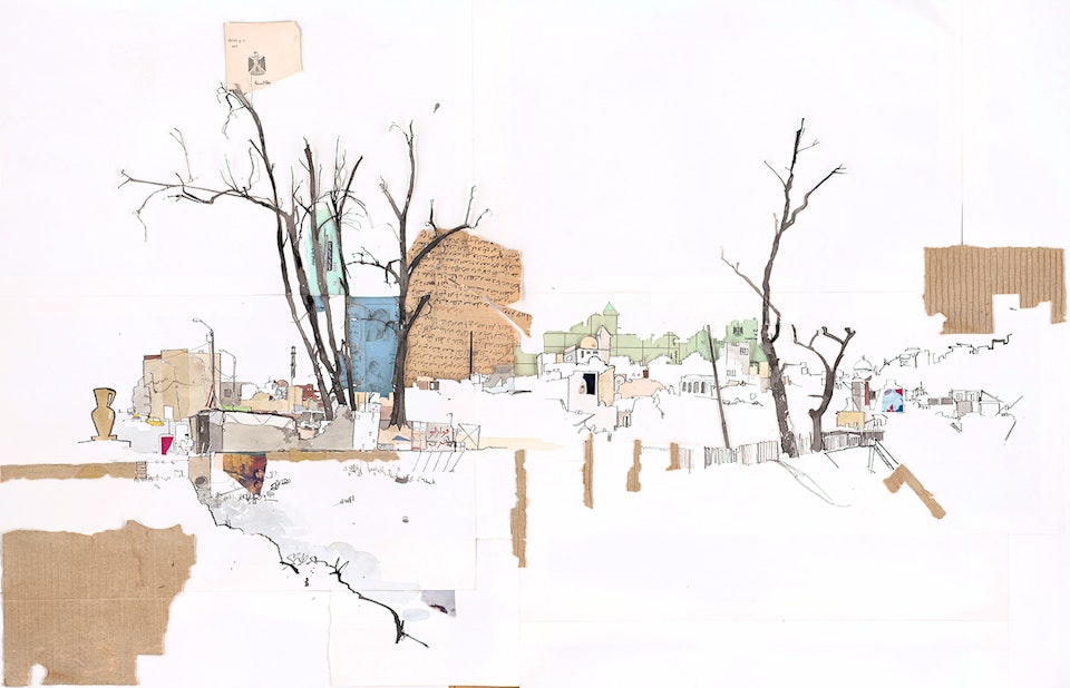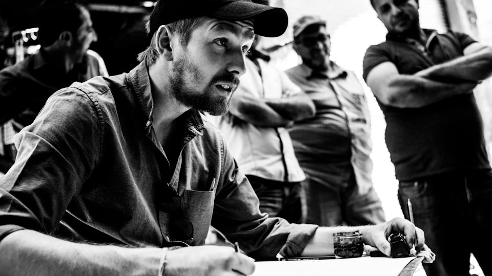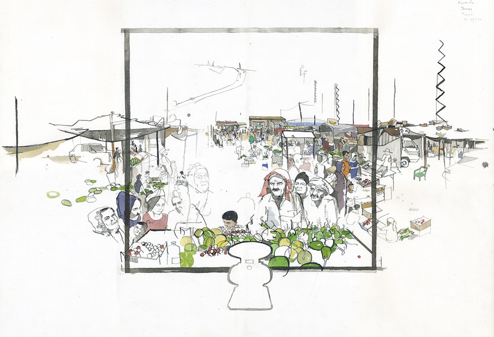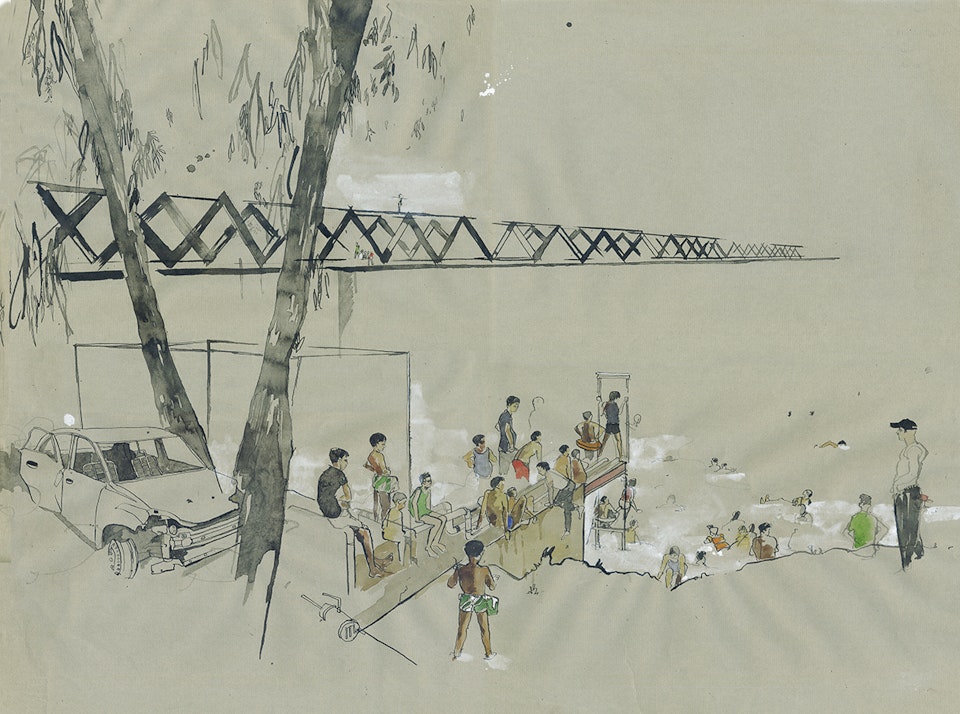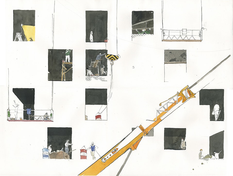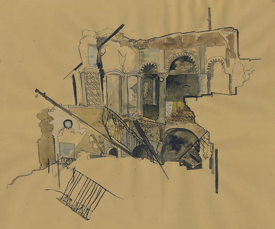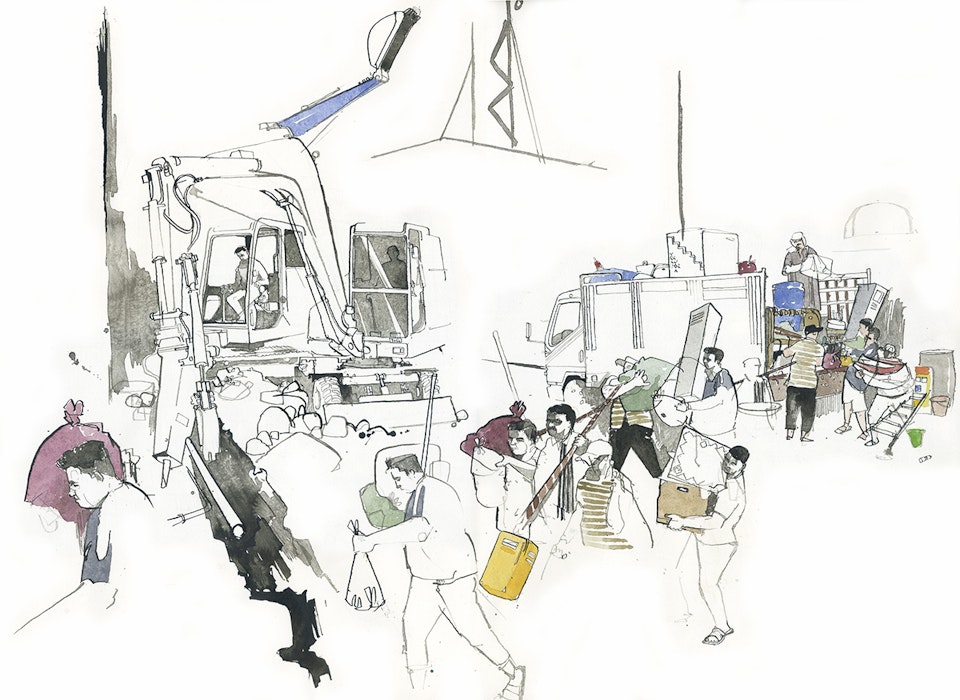 This used to be a multi storey car park in downtown Mosul. But over the two days that I drew it it is slowly being demolished. Each morning at 4am these men start work this car park in West Mosul. By Midday it is too hot to work an more. They charge $300 for the use of their bulldozer and the metal is pulled out for scrap. It's the beginnings of an overwhelming and much needed rebuilding.