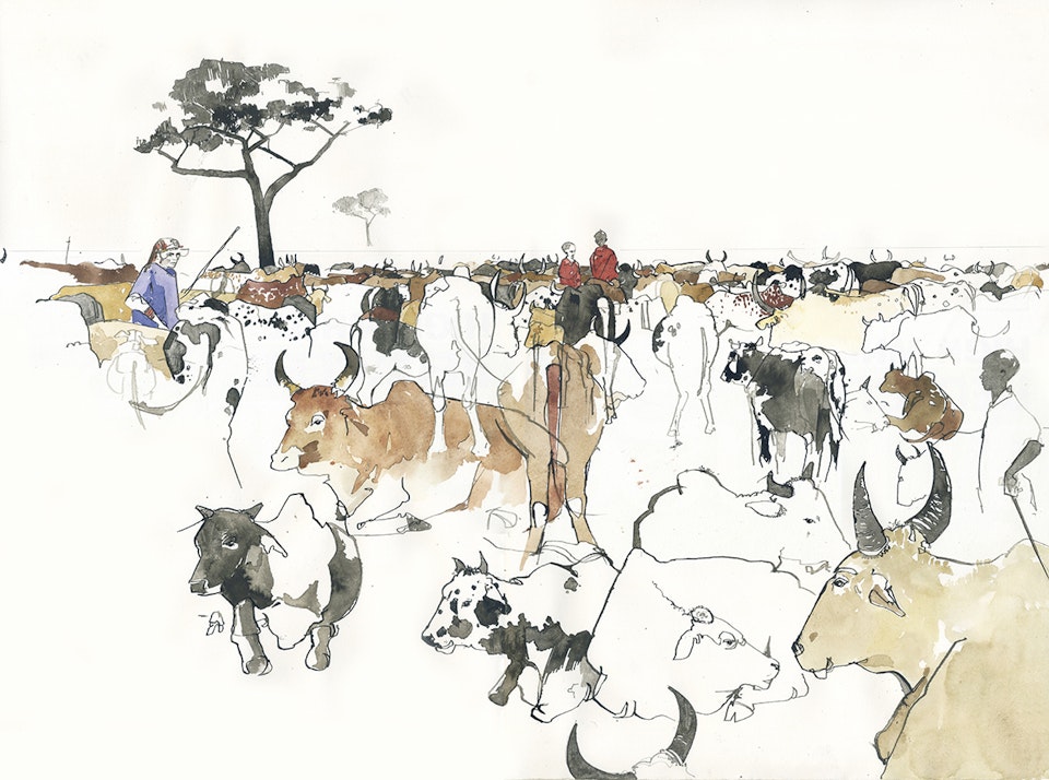 Migration with their livestock comes more naturally to Masai than perhaps anyone else. Many are now settled in their bomas but they wouldn't think twice about moving to follow the rain or the grazing. These cows belong to Kimoono a Maasai man and are kept inside a circle fo thorns that make the fence around his home. The tiny, tiny footprints in the top right hand corner is where one of the millions of flies has dragged its body out of a splodge of ink.