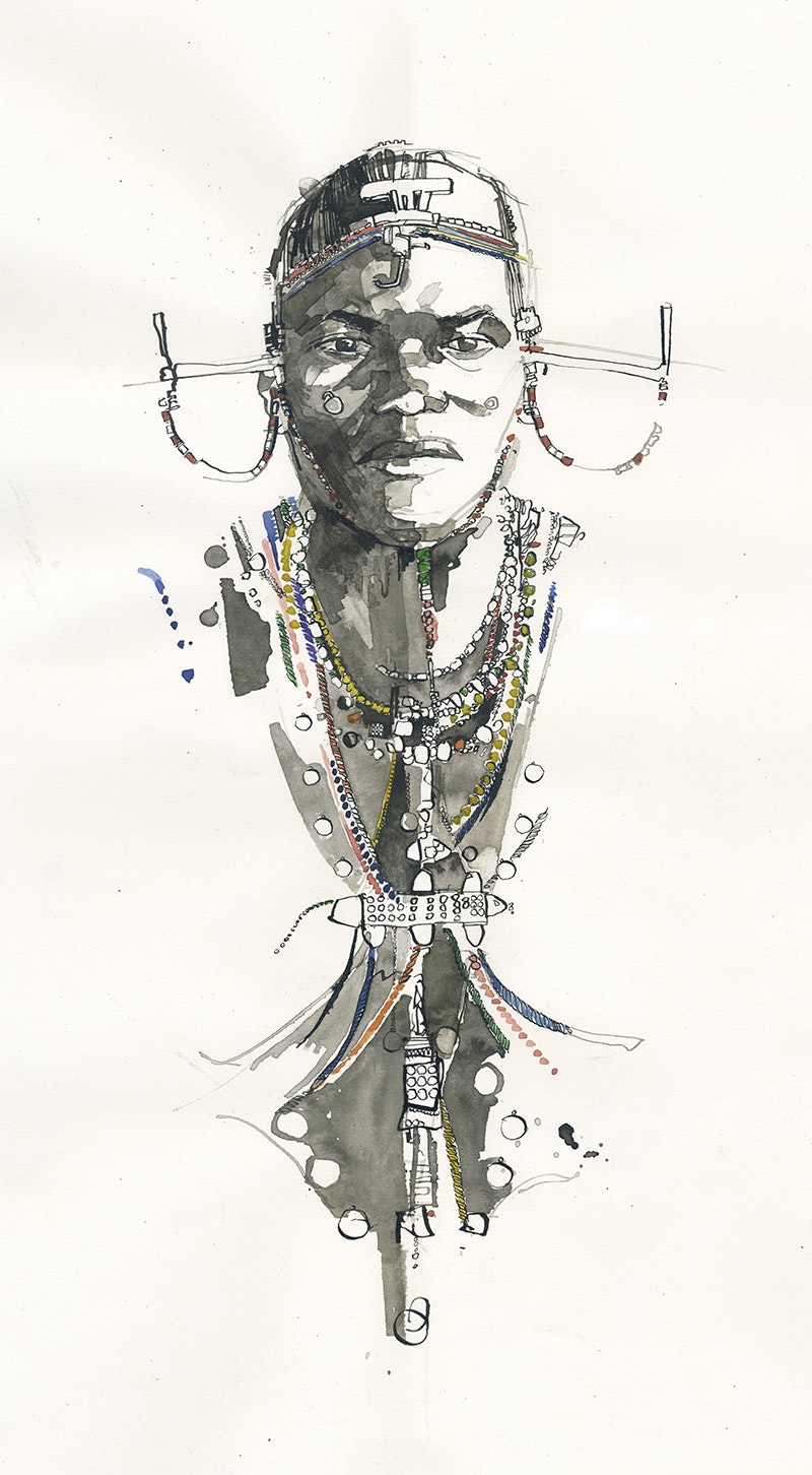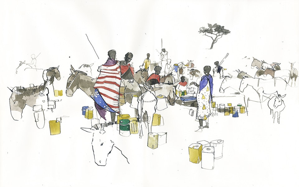 Sometimes there is a scene that no matter what you were doing you have to stop and draw. This was one of those. I stood under an acacia tree and drew this waterhole. It had been put in to stop the local Maasai travelling to Amboselli National Park for water. As ever it is often the women doing the water collection. They'll be back here in under a week to repeat the process which is so vital to life in one place.