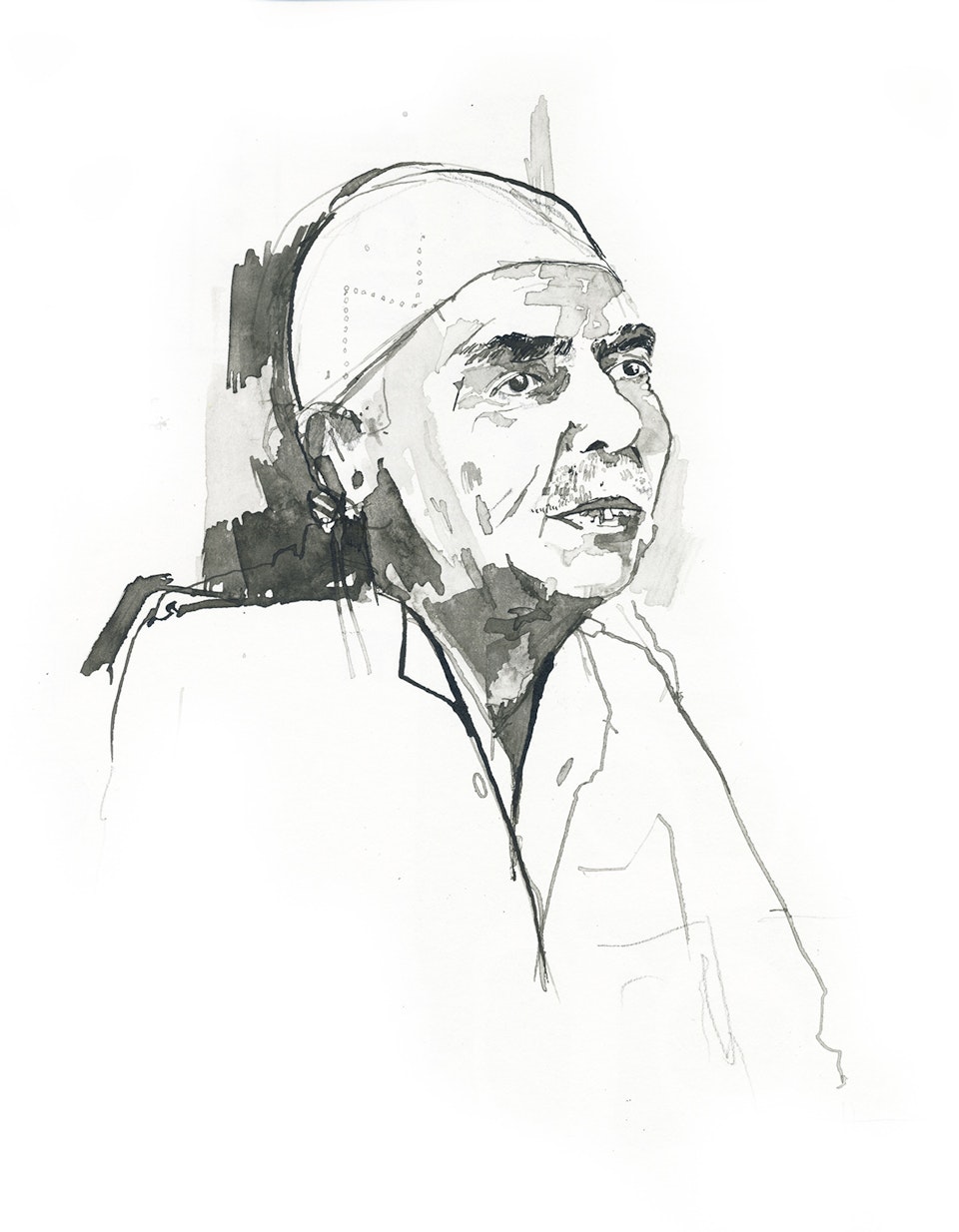 A message shared by most of the world but written on the dome of the destroyed Al Nuri mosque. I drew Yousef F. Mohamed who was arrested and thrashed 300 times over eighteen days for smuggling officials to Turkey, a charge he admits. He had both his cars and his home confiscated. His home was later destroyed and he now lives in this rented house with his brother's family at the bottom of the once famous leaning minaret known as "the hunchback" but blown up when ISIS left.