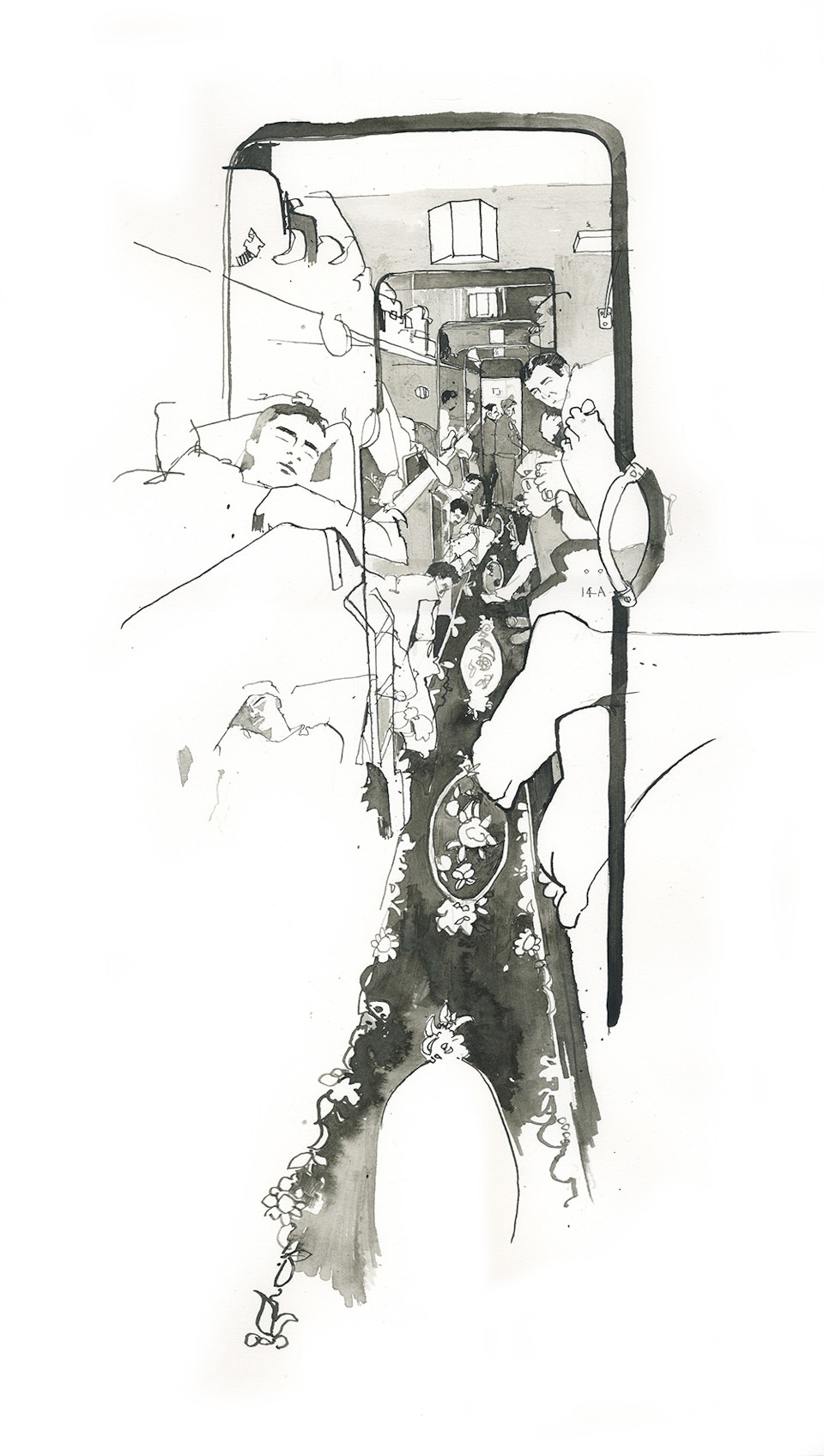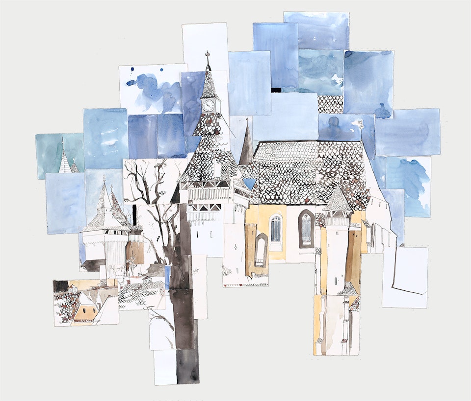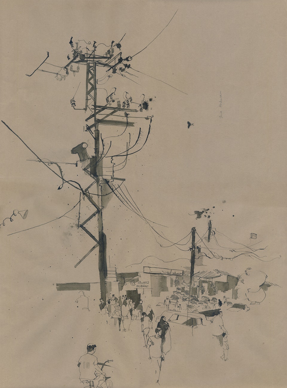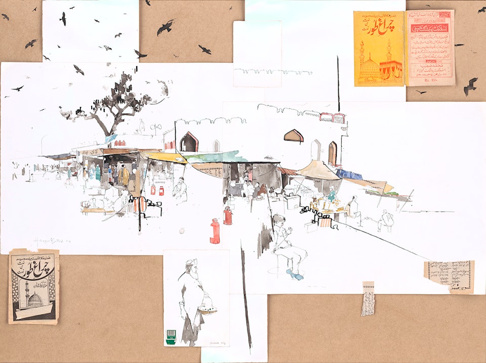 A flock of black kites circles the market outside the Jama Masjid in the heart of Delhi. At the same time thousands of Muslims come to one of the biggest mosques Hindu dominated India and this market serves there needs with prayer books and educational texts. I did this drawing over two days on two separate sheets and collecting the collaged pieces from the market