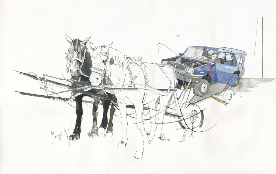 Two Romanian men take a a car to scrap balanced on the back of their horse and car. One jokes about sitting in the drivers seat. The hay for the horses is keep in the empty engine compartment and the steer by sitting on the roof. I met them on this back road because they were trying to avoid the main roads and the police.