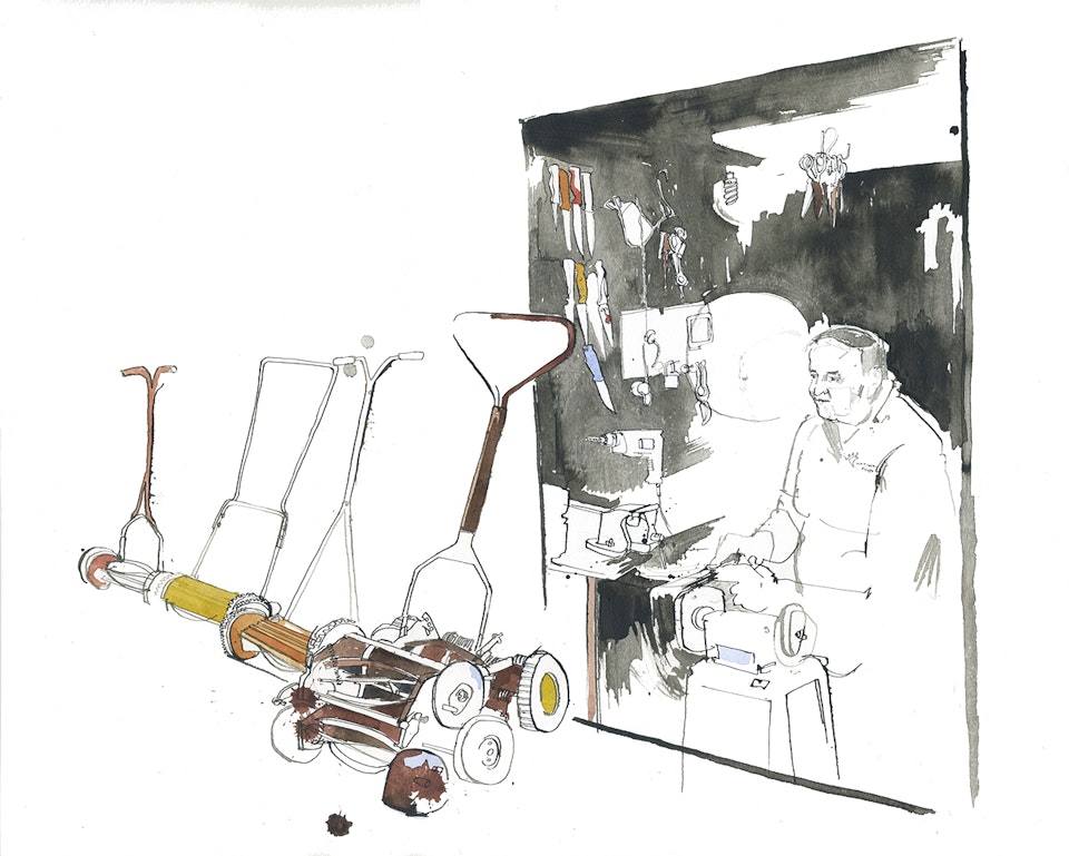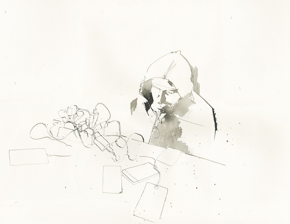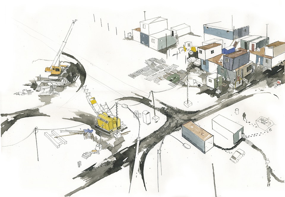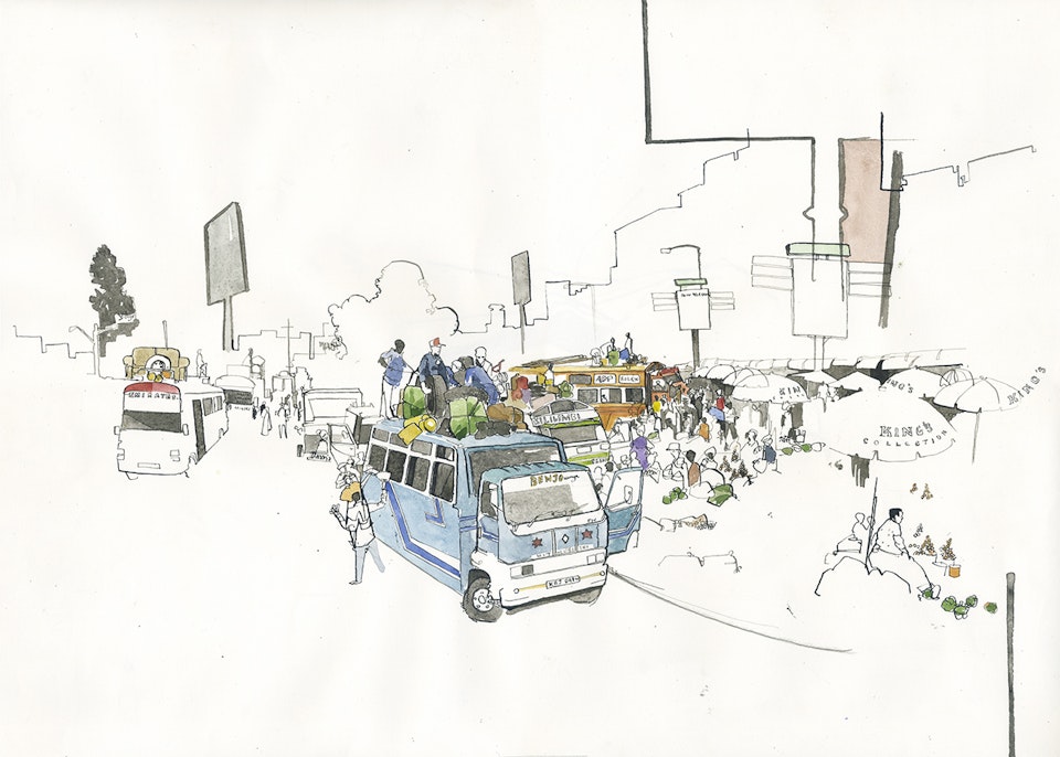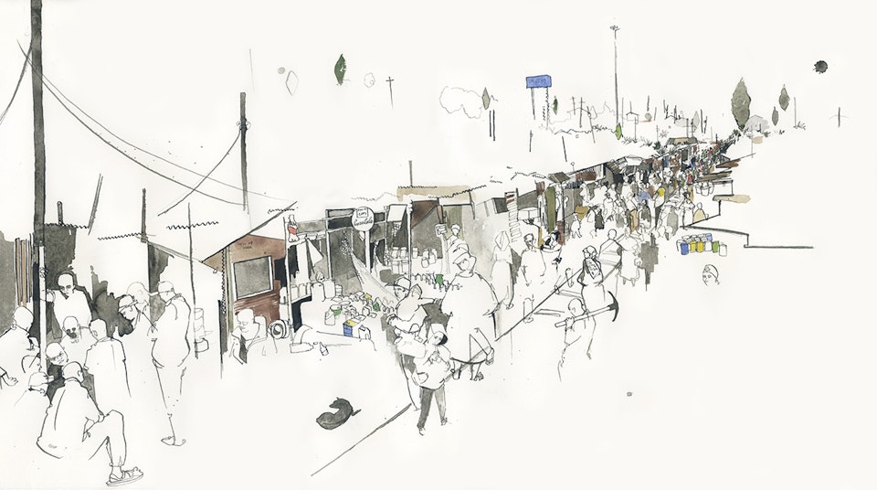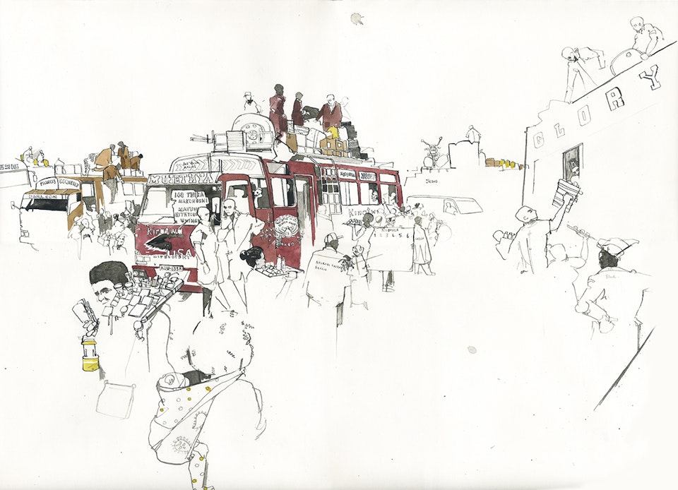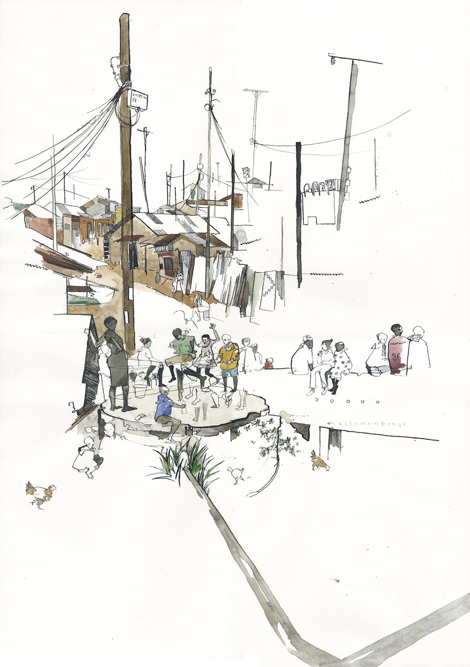 Children play on a old water tank platform at the bottom of the hill in Kibera, Nairobi. As I draw, a man called Dan looks over my shoulder holding a hammer. He moved here as a young man in the 80s to 'lift things' - to find work in construction. Now his kids grow up here. He's a big Wayne Rooney fan, but is disappointed to know Wayne doesn't go to church every Sunday. As he leaves he say's "Tell Rooney to go to Church".