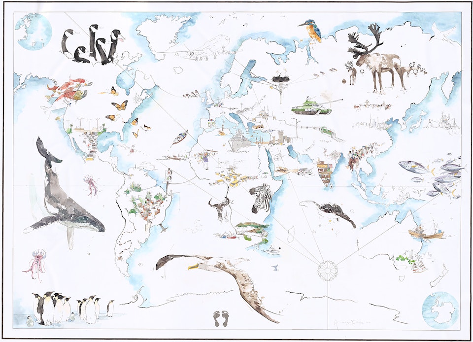 Anima Mundi literally means 'Soul of the Earth' it is the suggestion that because all living things exist on the earth that there must be a connection between them. This is no more obvious than in the migrations that many species make - interacting contour lines on the surface of the Earth.