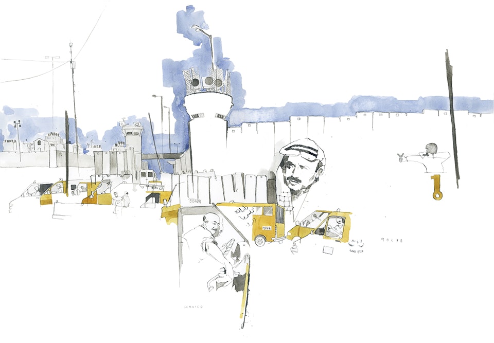A gate between the West Bank and Israel which many Palestinians aren't allowed to drive through so they have to get out walk through and get a taxi the other side.