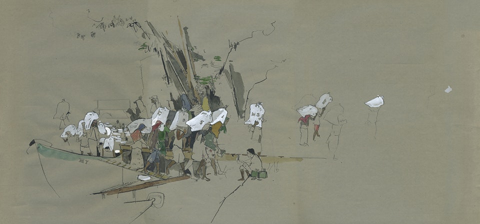 One morning in Yangon, Myanmar I boarded a rice boats down the Irrawaddy Delta. Its job was to collect the rice from the mill and bring it back to market - which it did over the next 24 exhausting hours. These women unload each sack into the mill, as they pass down the ramp they take a stick from the man sitting down. One for each bag. They are paid according to the number of sticks at the end.