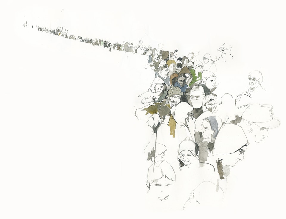 Each day, partly through lack of anything else to do but mainly due to hunger - the migrants in the Idomeni transit camp would queue up hours before lunch around a fence built to keep them off the farmers corn. At the very front, amongst the crowd, a little girl smiled at me the entire time. It's her that I remember most about this image.