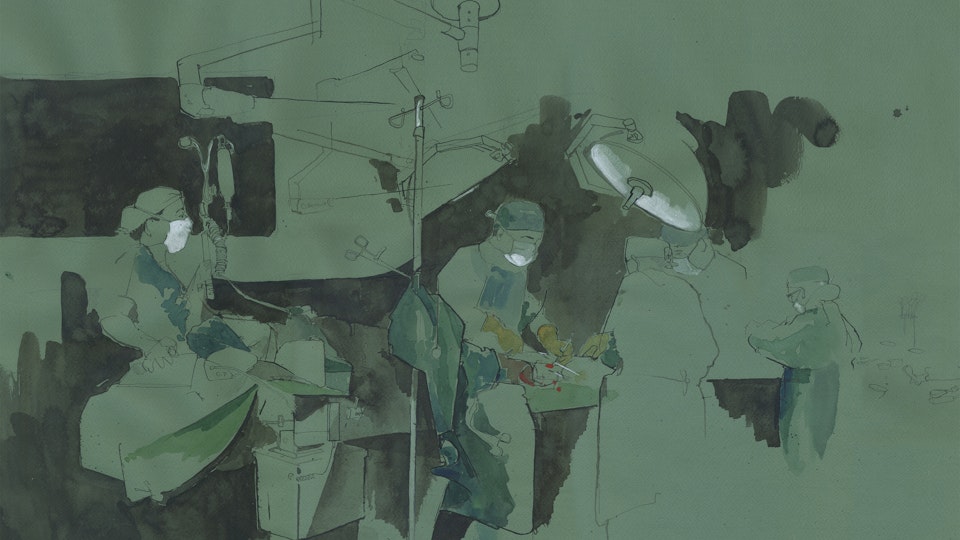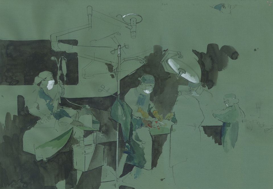 As I was drawing Raj, a 60 year old man having an opponensplasty (an operation to restore strength and movement to a paralysed thumb) it occurred to me that there have been many crossovers between surgery and art. Leonardo da Vinci and Henry Tonks were two of them; both using drawing as a way of comprehending the human body.