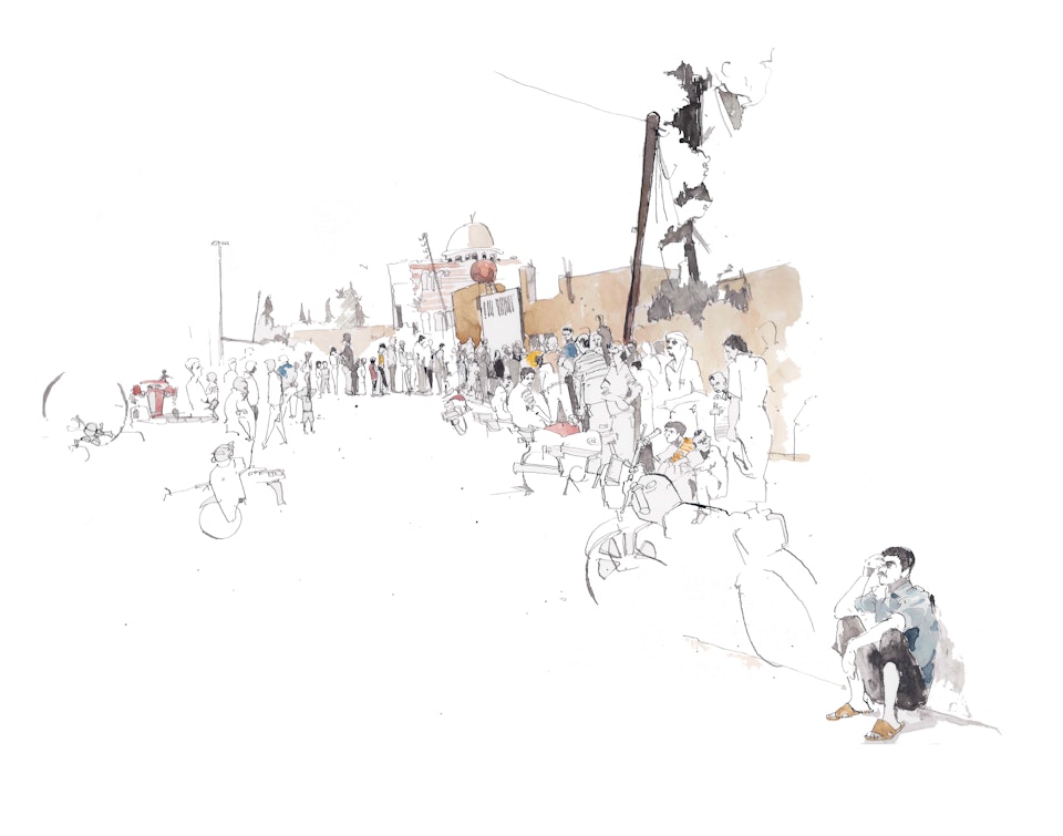 My understanding is this, there is not an extreme shortage of food here, nevertheless short enough to be only allowed 3 flat breads and short enough that two large queues form each day at the main bakery, in the background the scenes of a battle from 2 weeks ago.